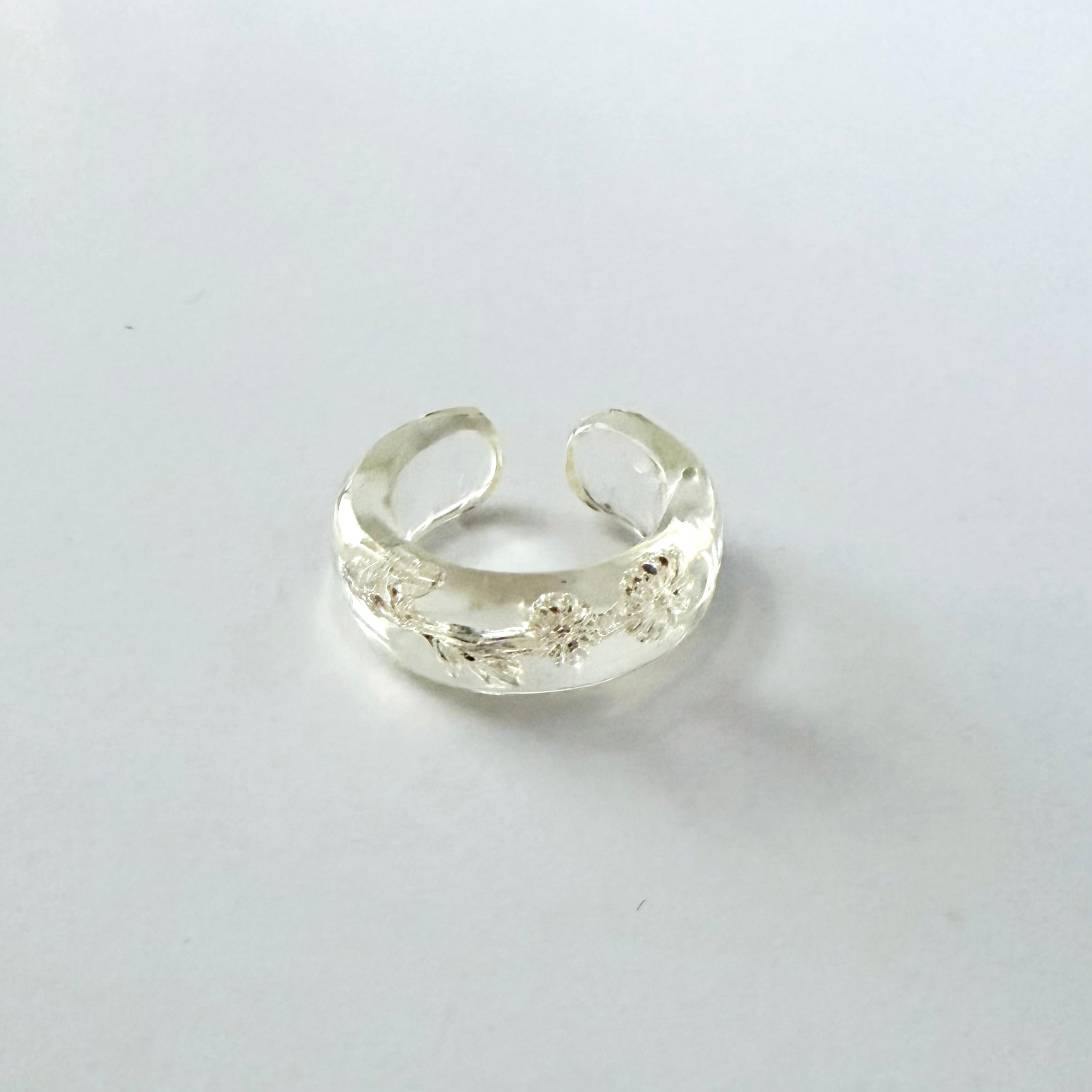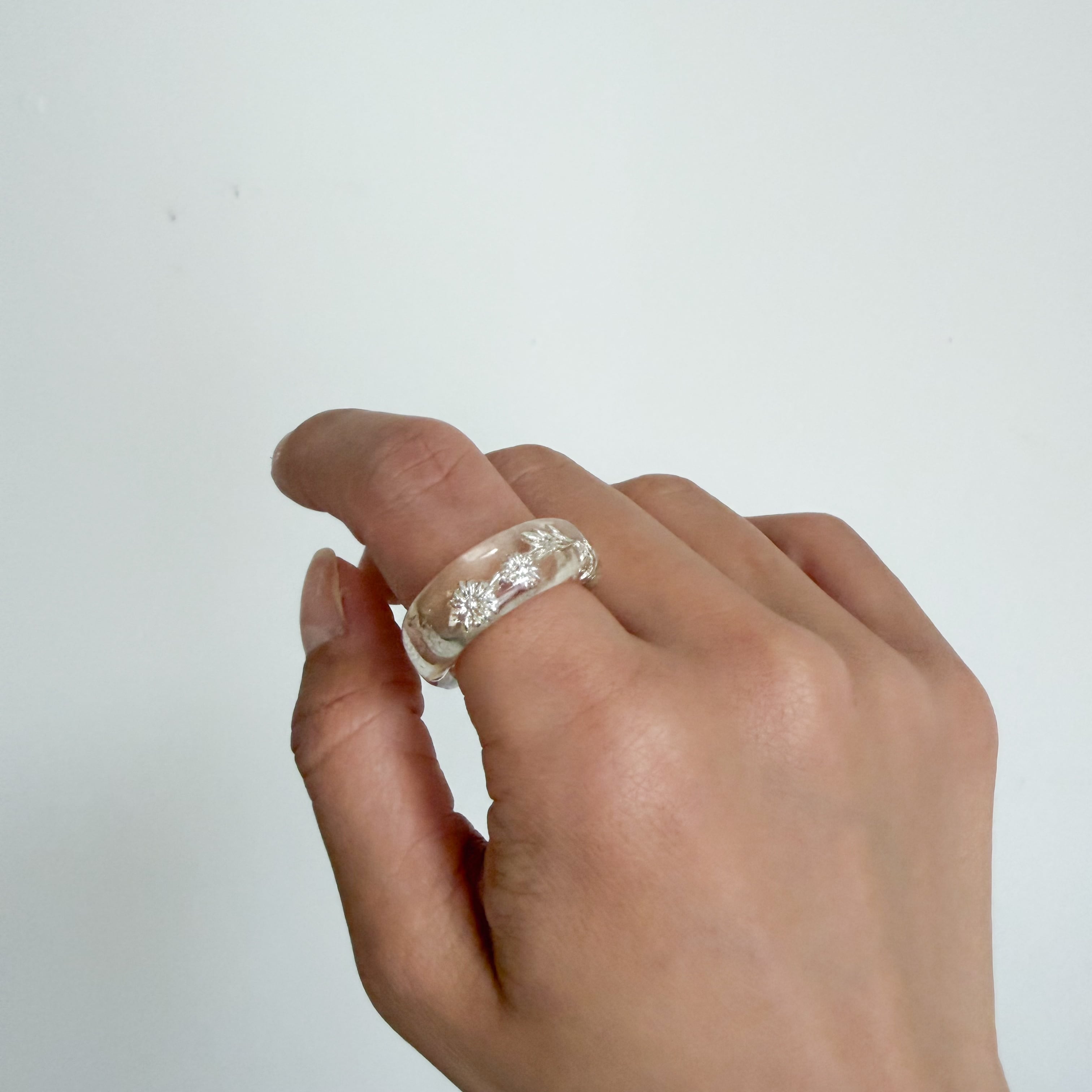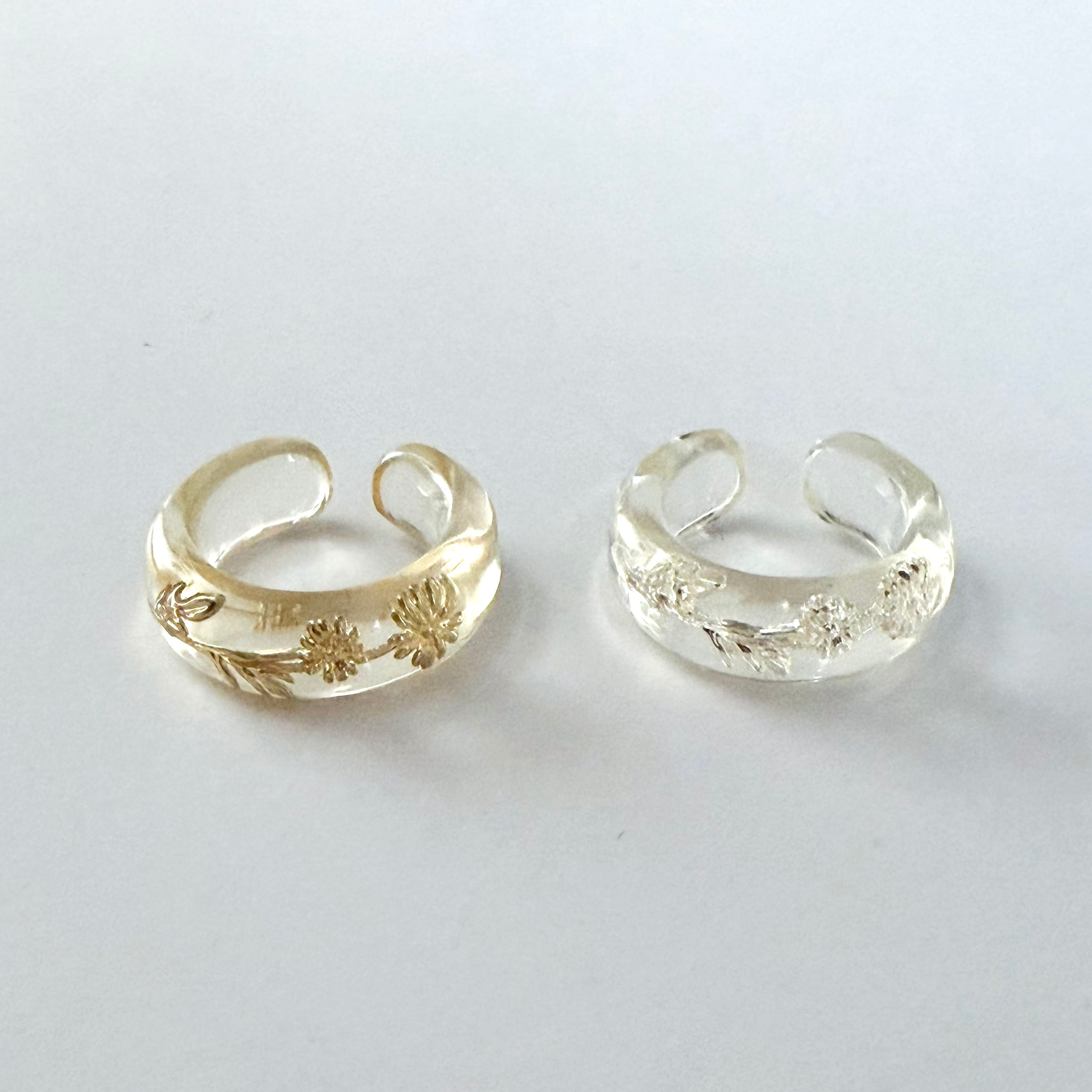 メタルのフラワーパーツが埋め込まれたアクリルリング。